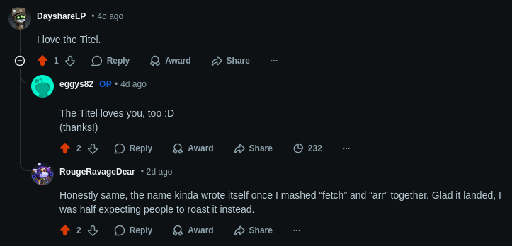 I'm terrible at naming these things, so I'm grateful to have someone who came up with the name "fetcharr". A few days after it released. Glad someone is on the ball, at least!