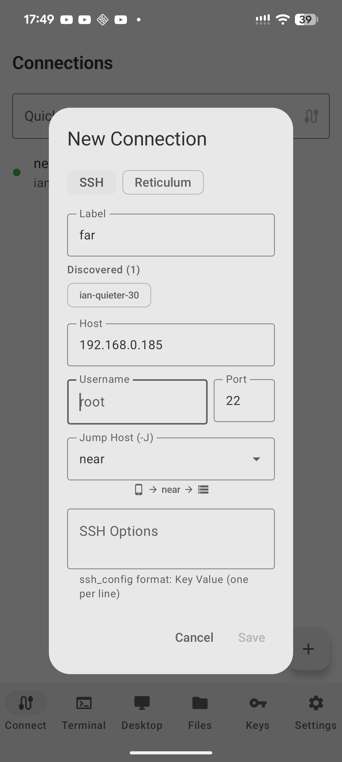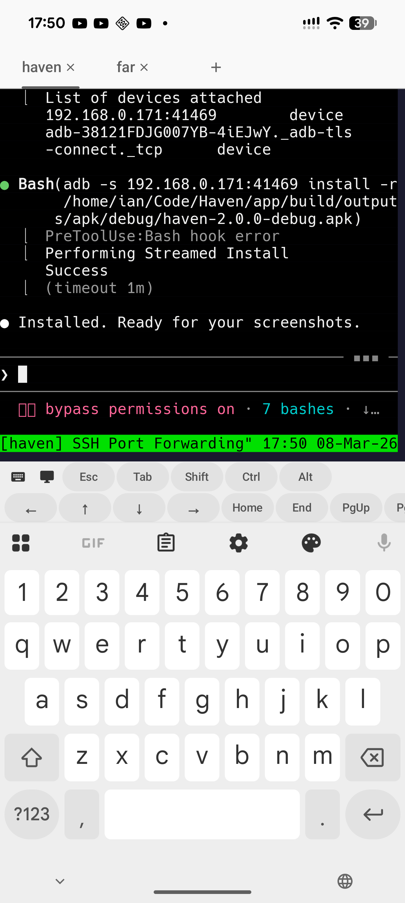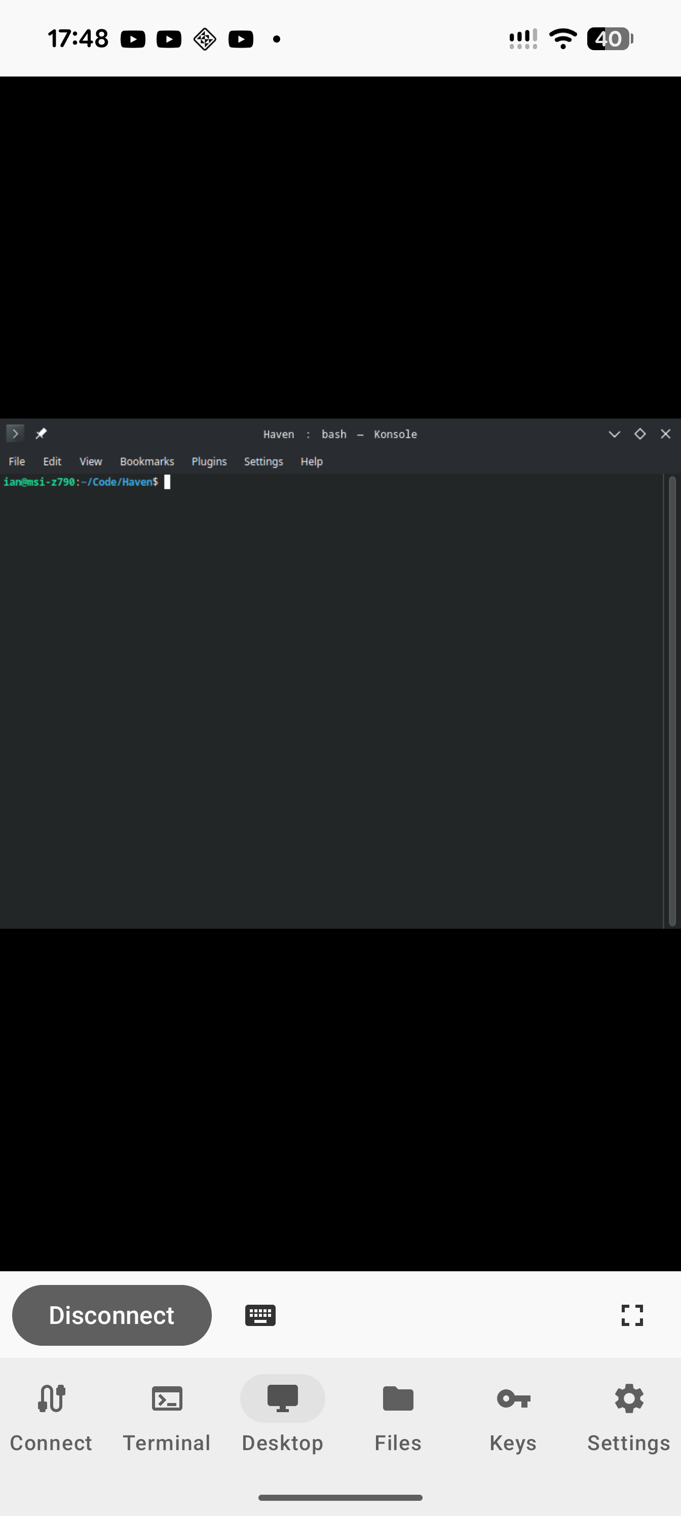 - Android Terminal VM (Pixel 8+): Google's official Linux VM runs a full kernel via pKVM. It's more capable but only available on Pixel 8 and newer. PRoot runs on any device back to Android 8. Haven can SSH into an Android Terminal VM if you have one — see the connection settings.