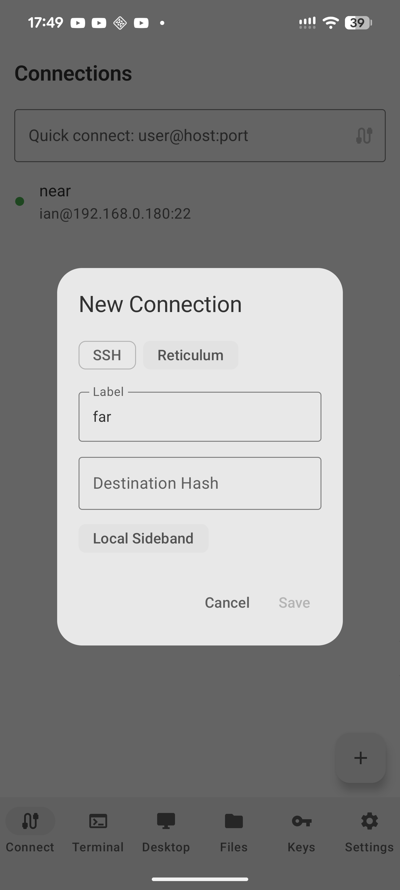 Reticulum — Connect over Reticulum mesh networks via rnsh or Sideband with announce-based destination discovery and hop count.