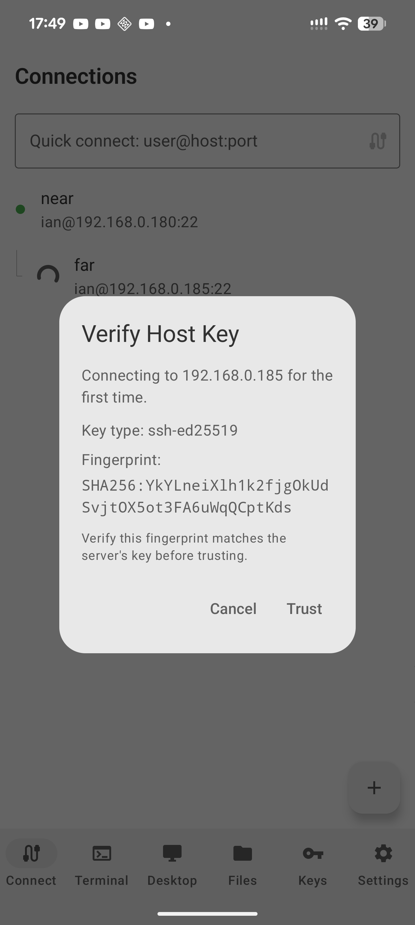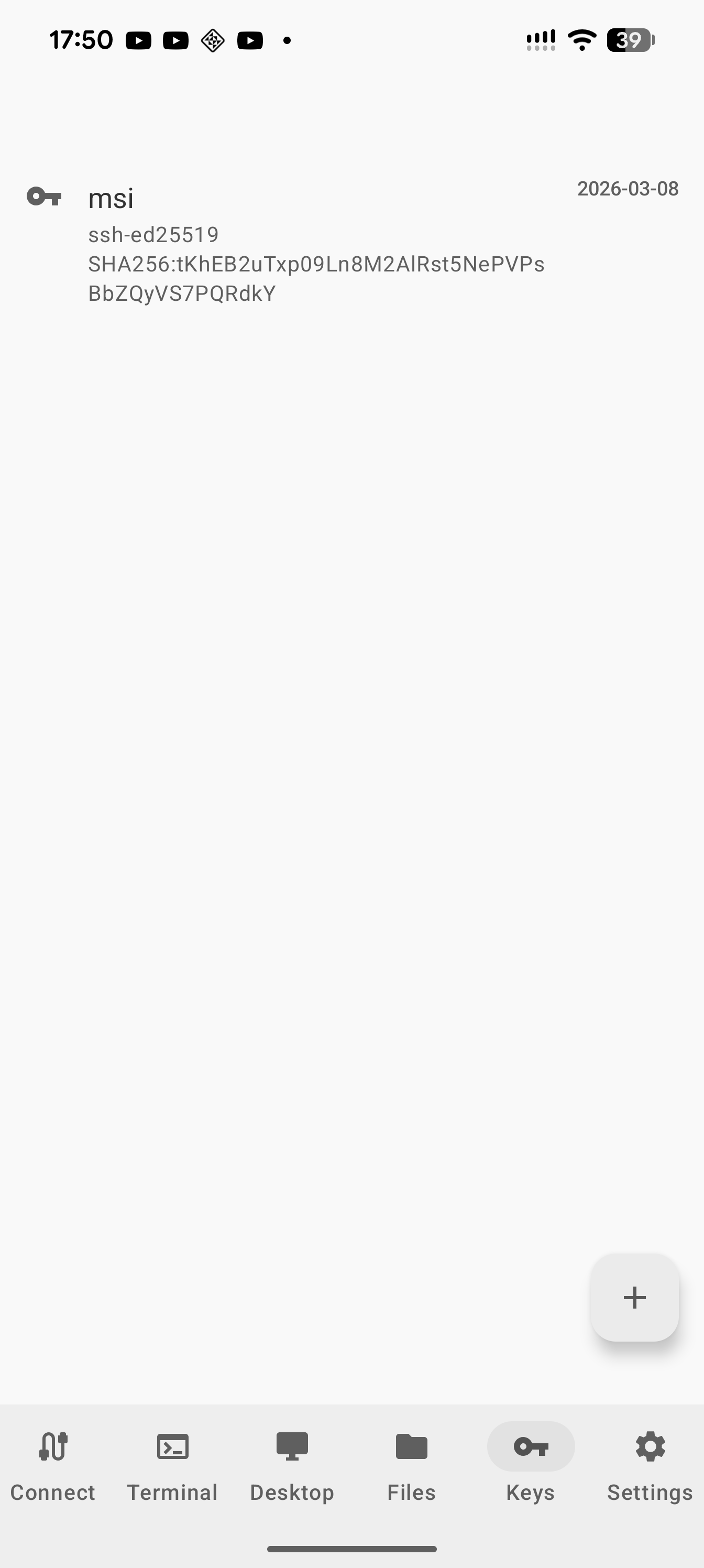 SSH Keys — Generate Ed25519, RSA, and ECDSA keys on-device. Import keys from file (PEM/OpenSSH/Dropbear format) or paste from clipboard. One-tap public key copy and deploy key dialog for authorized_keys setup. Assign specific keys to individual connections.