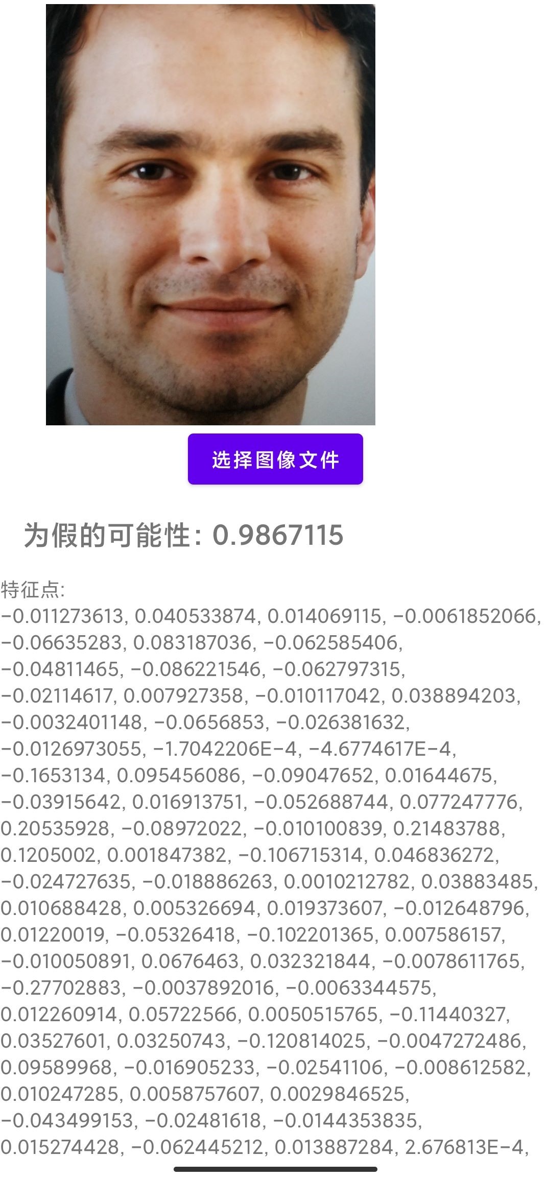 • 人脸识别,使用 tensorflow lite,并输出特征点。活体检测,仅支持打印攻击和重放攻击。请查看 TestFileDecActivity 文件