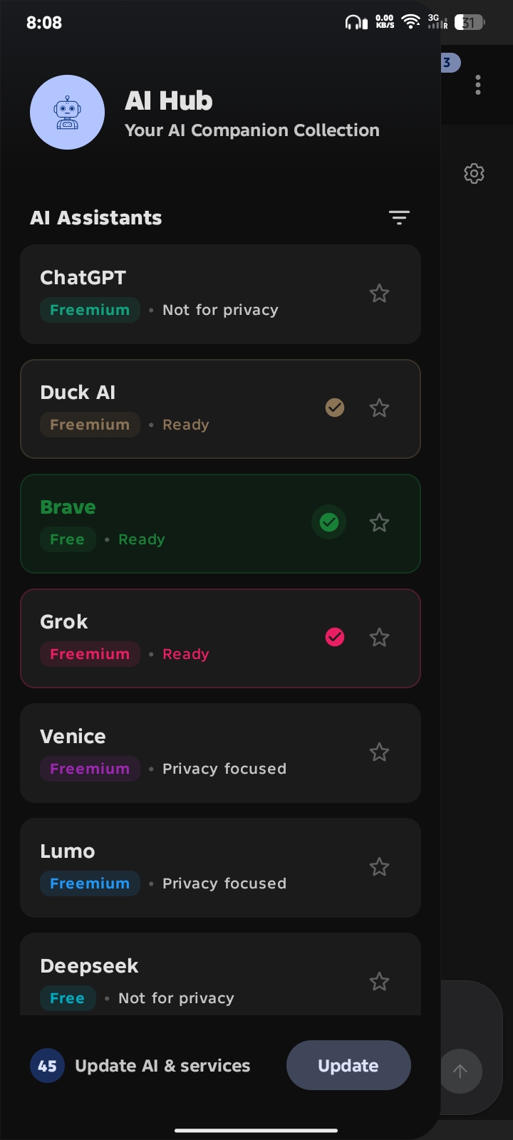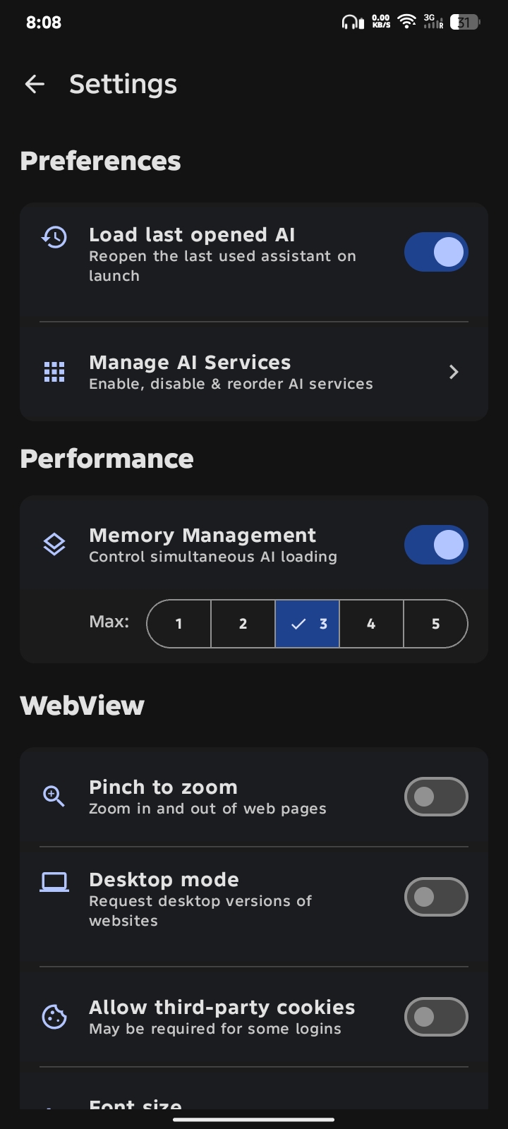 Introduction: All-in-one Kotlin app that aggregates multiple AI assistants in a single tabbed interface, featuring webview integration, Material Design 3, and persistent session management.
