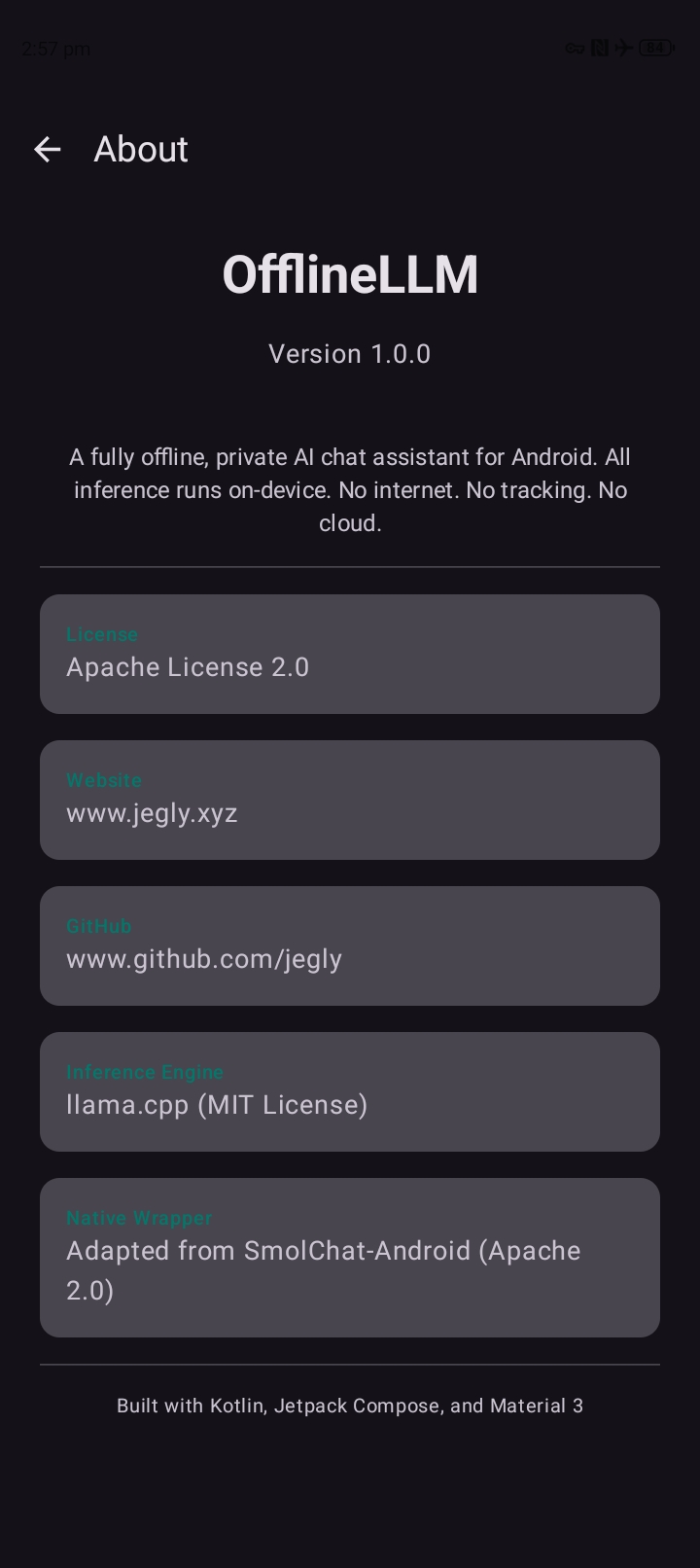 llama.cpp backend: MIT License. Native wrapper adapted from SmolChat-Android (Apache 2.0).
