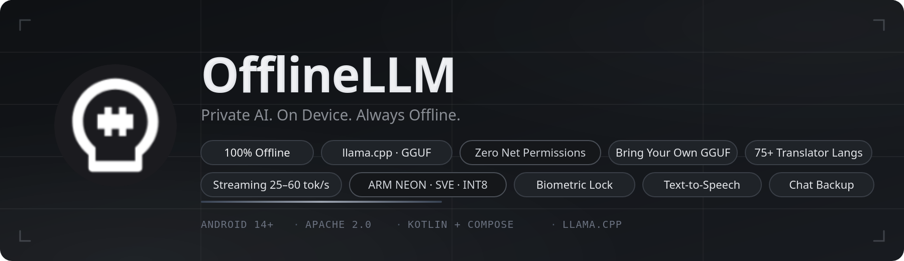 The only Android LLM app that literally cannot phone home. All LLM inference runs entirely on-device via llama.cpp. No internet. No cloud. No tracking. Your conversations stay yours.