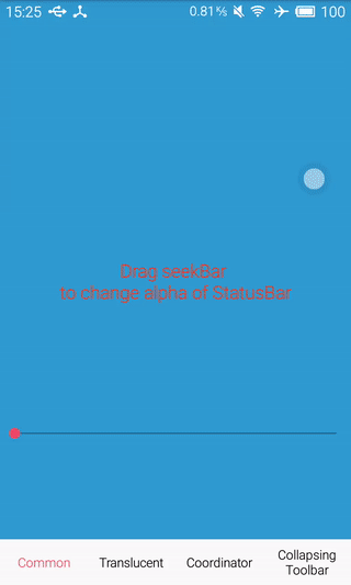 - CommonFragment 为正常布局, 可以通过 SeekBar 来调整状态栏颜色的 alpha 值. 调用方法为: