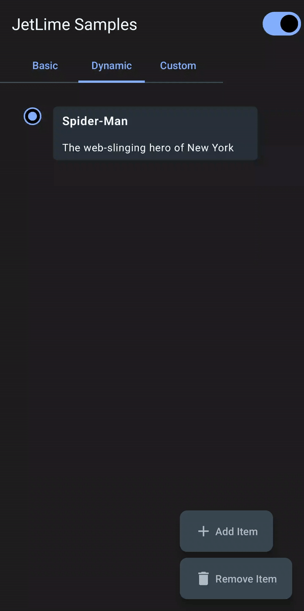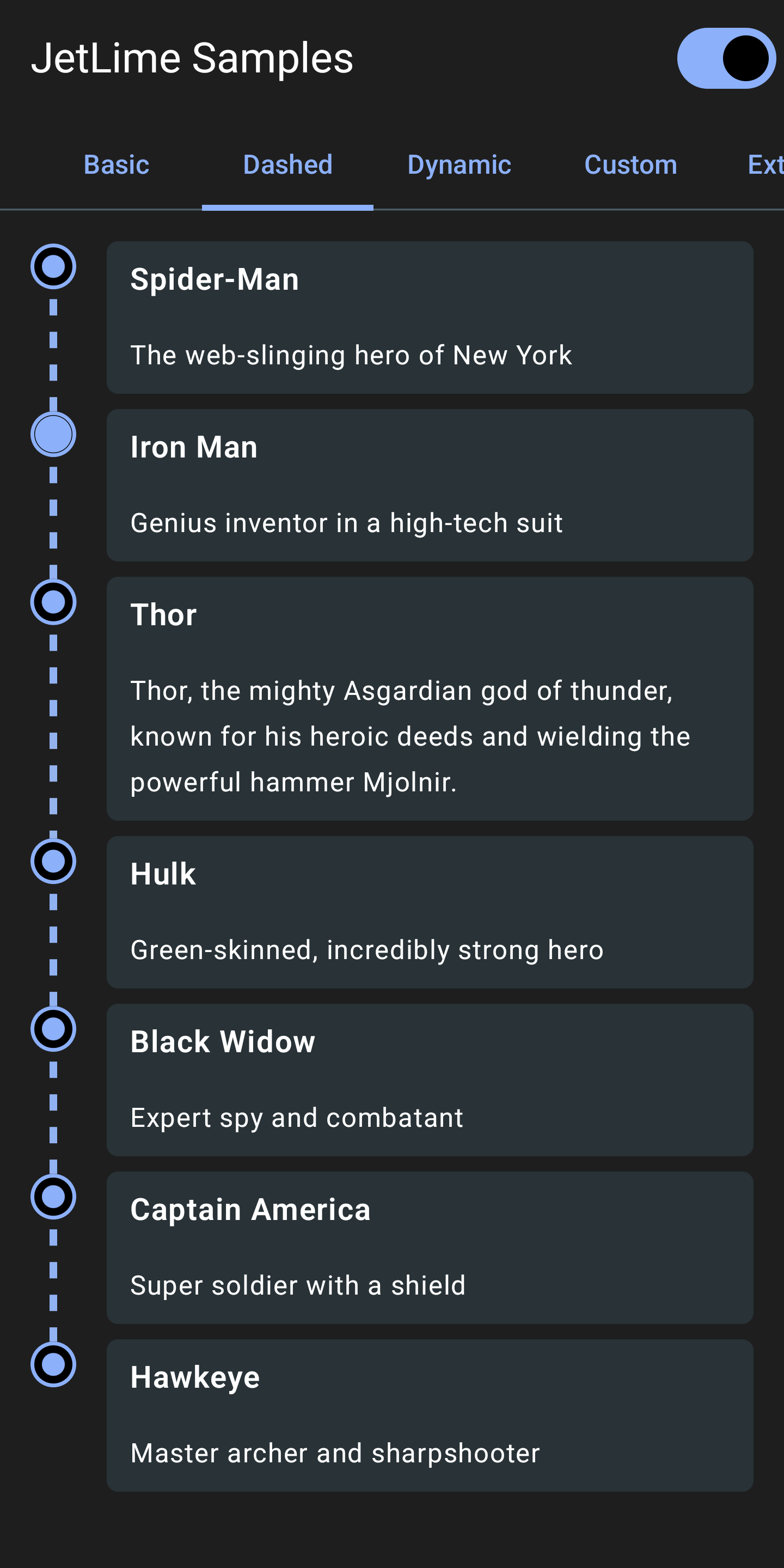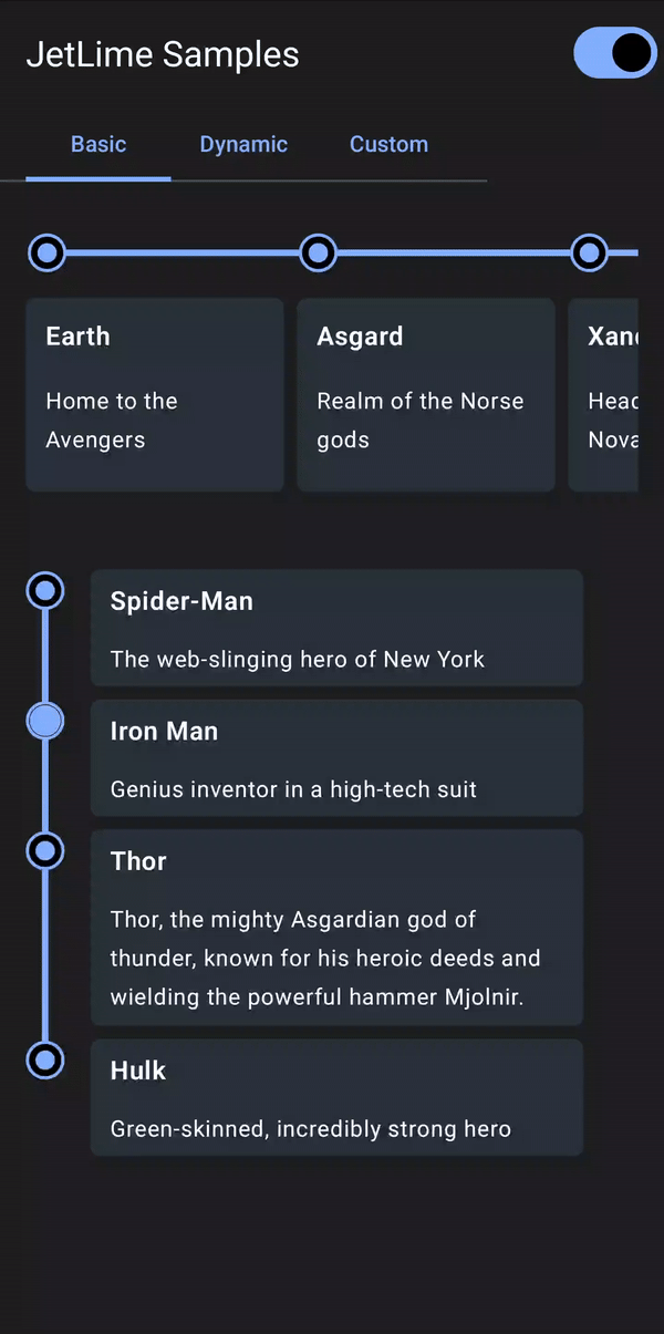 - Works for both JetLimeColumn (vertical) and JetLimeRow (horizontal).