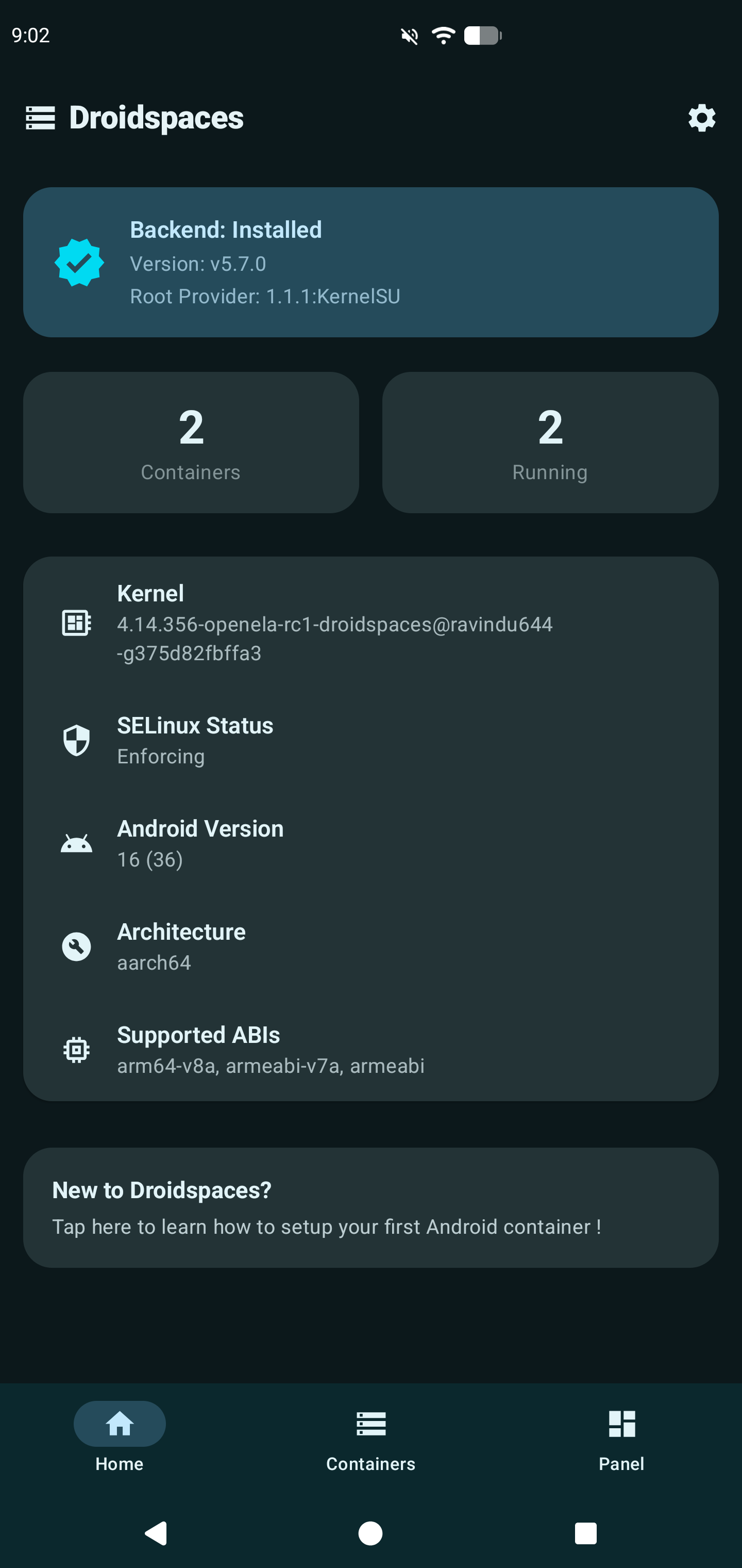 APatch Supported* Requires enabling Daemon Mode in the Droidspaces app and a device reboot to bypass root-domain seccomp restrictions on userspace-initiated runtimes.