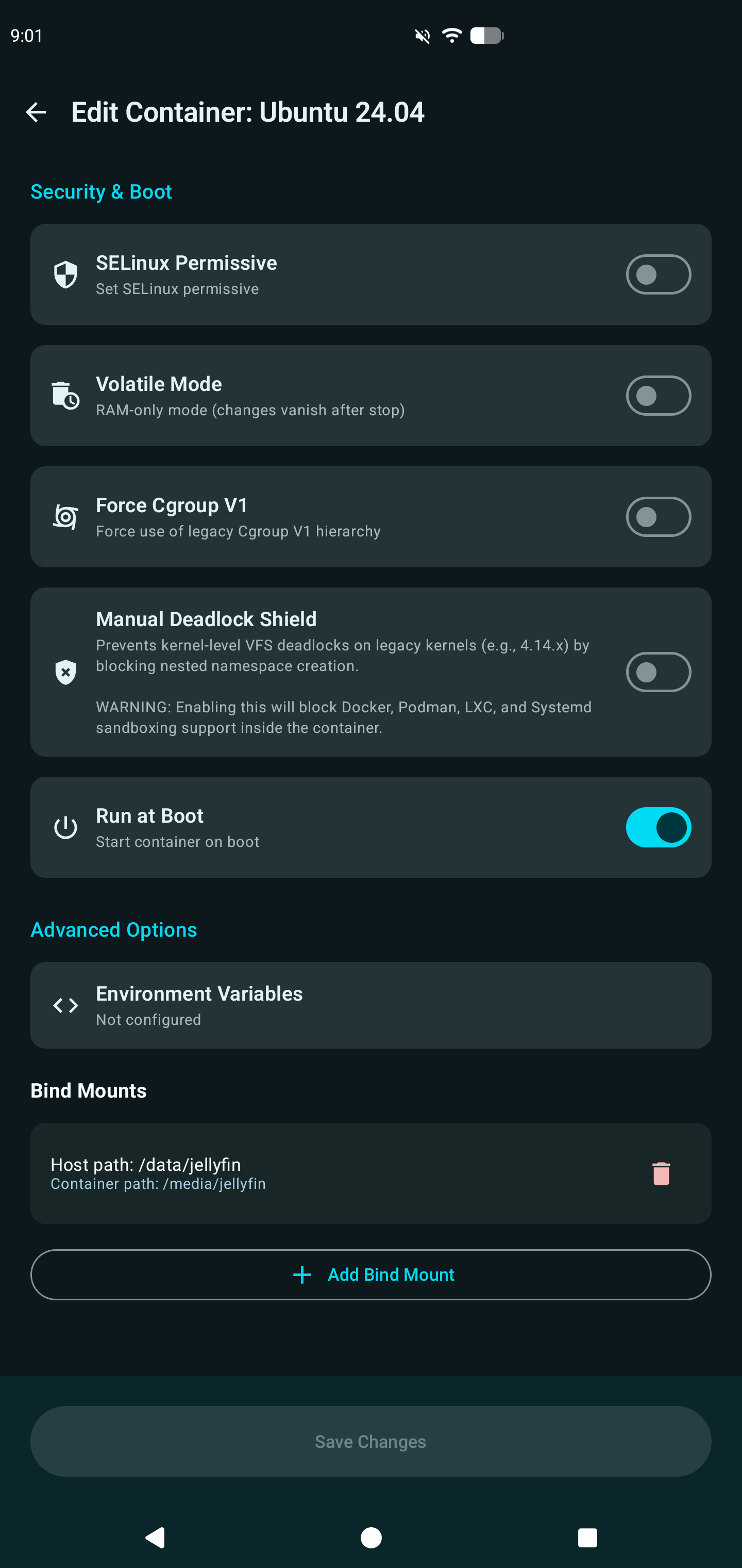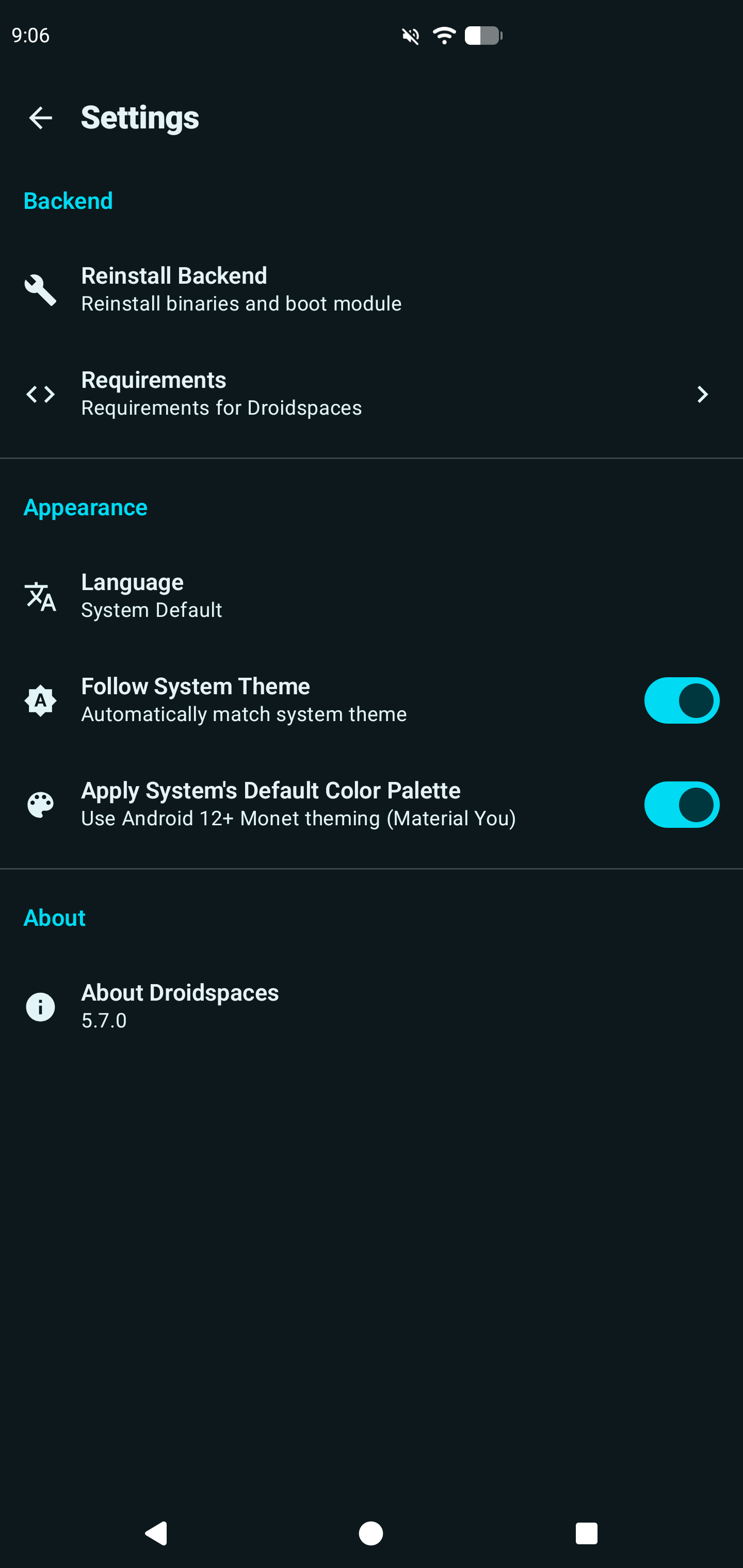 Magisk Supported* Requires enabling Daemon Mode in the Droidspaces app and a device reboot to bypass root-domain seccomp restrictions on userspace-initiated runtimes.
