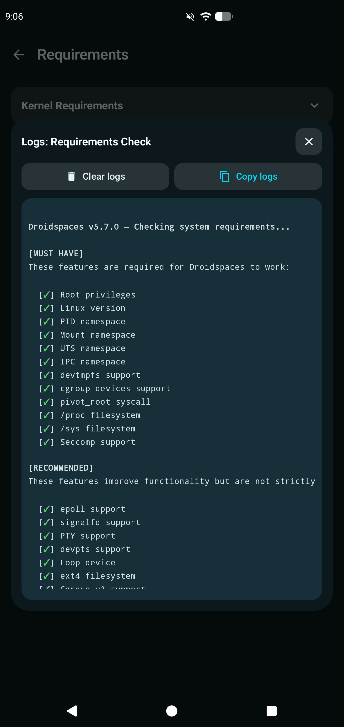 Droidspaces supports Android devices running Linux kernel 3.18 and above: