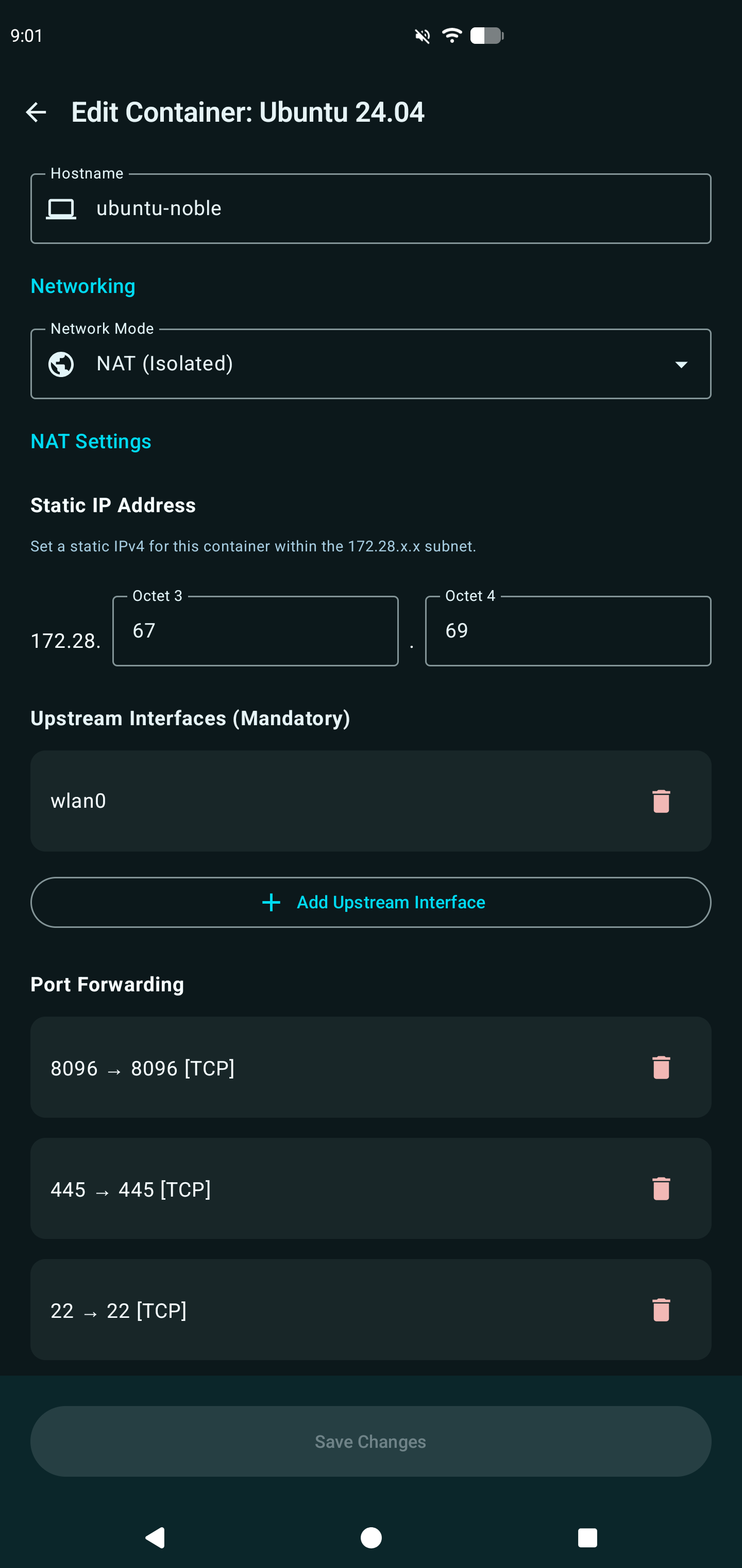 Network Isolation 3 Networking Modes (Host, NAT, None). Pure network isolation via CLONE_NEWNET (NAT/None modes) or shared host networking (Host mode). Works on both Android and Linux.