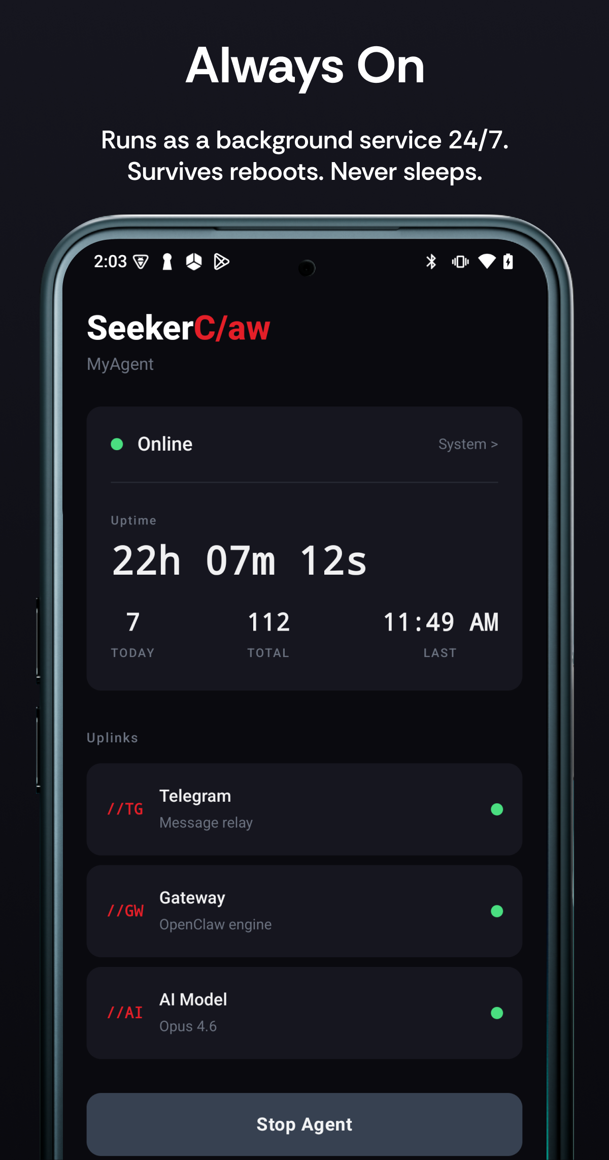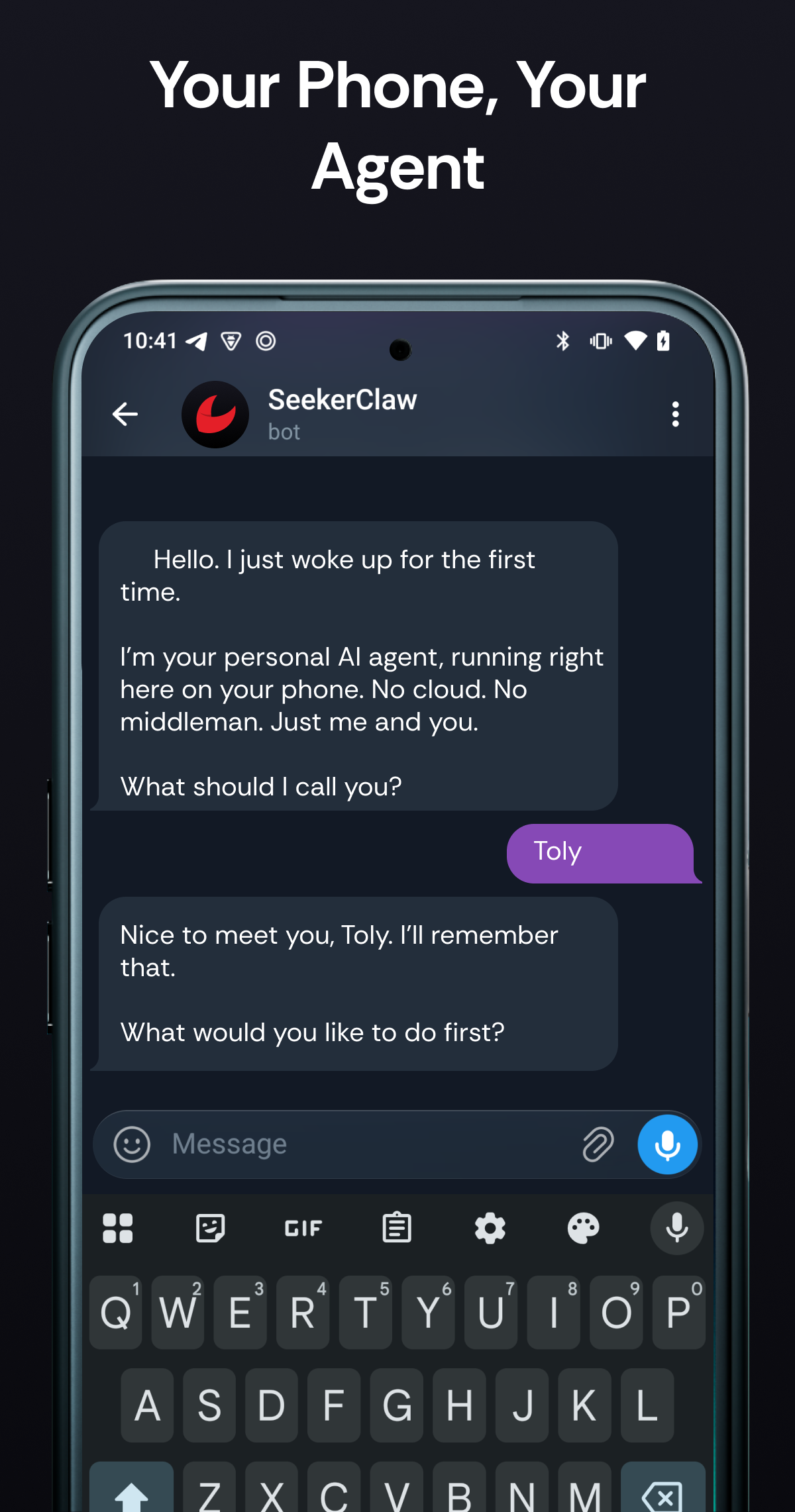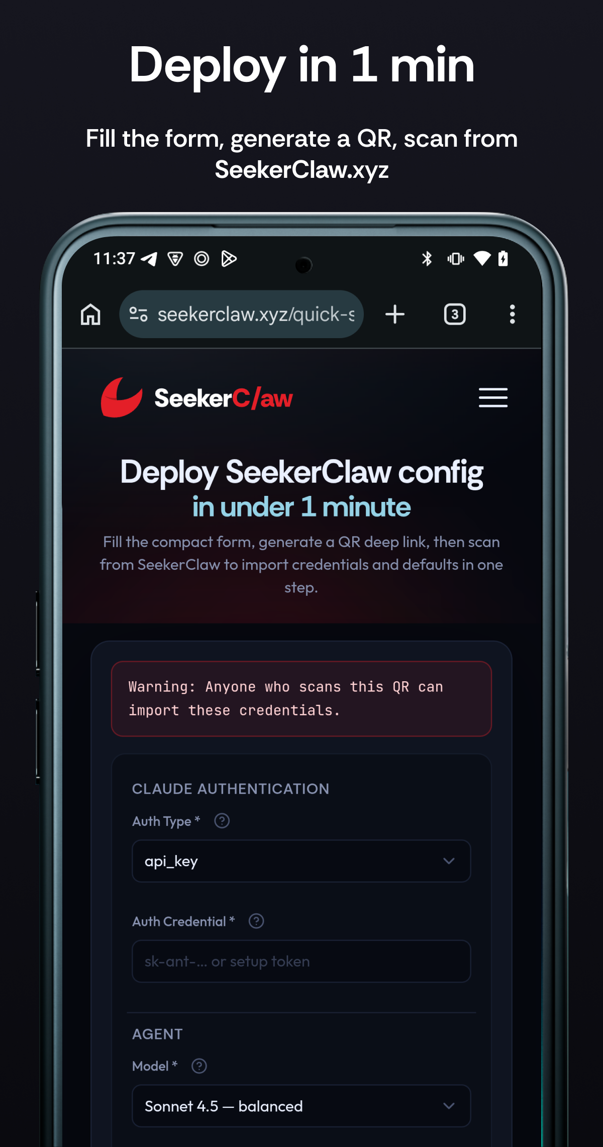 Open the app → pick your AI provider (Claude, OpenAI, or OpenRouter) → enter your API key + Telegram bot token + choose a model + name your agent — or generate a QR code at seekerclaw.xyz/setup and scan it. Done. For custom gateways (DeepSeek, Ollama, LiteLLM, etc.), configure in Settings after setup.